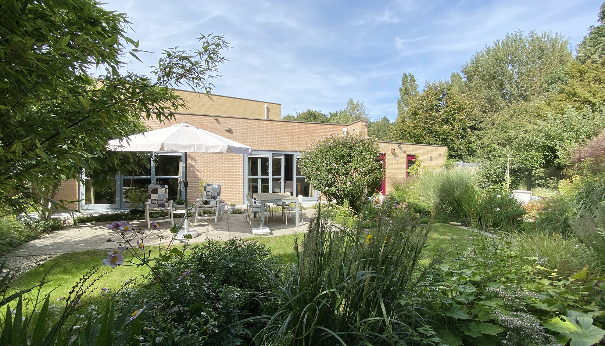Fraai beplante tuin voor, achter en opzij, met terrassen en grindpaden. De grote achtertuin op het zuiden biedt veel privacy.